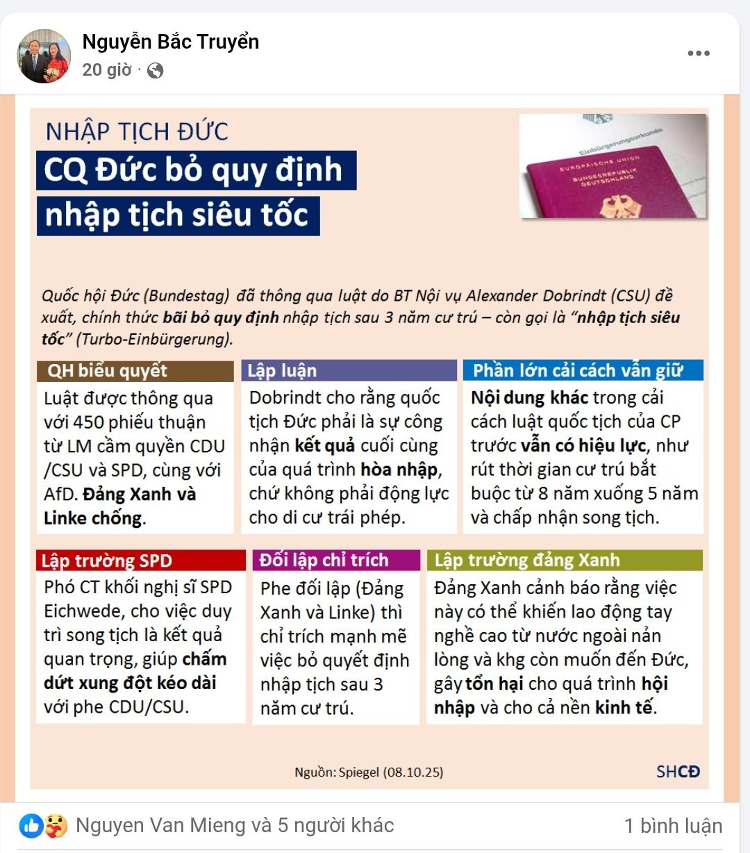 Ngày 08.10.2025 Quốc hội Đức đã thông qua dự luật của Chính phủ mới, bãi bỏ chính sách nhập quốc tịch siêu tốc „Turbo-Einbürgerung“ sau 3 năm ở Đức, dành cho người có thành tích hội nhập đặc biệt.