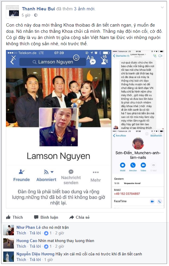 7:28 ngày 19.7.2017 ông Nguyễn Lam Sơn (Sơn điền) tiếp tục gọi điện ( từ số: +49 152 03704897), nhắn tin tới tòa soạn phỉ báng người khác và đòi rút bài :