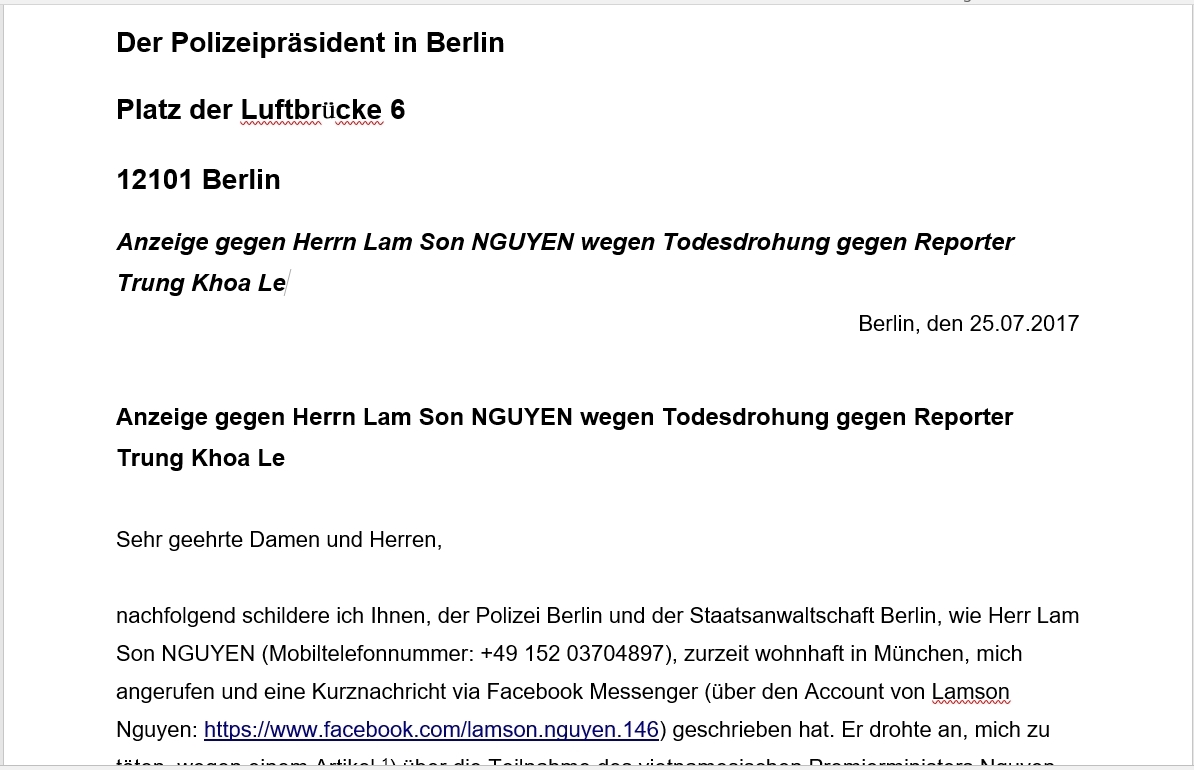 Hồ sơ ông Nguyễn Lam Sơn đe dọa giết hại nhà báo Đức đã chuyển cho cảnh sát điều tra Berlin ngày 25.7.2017.