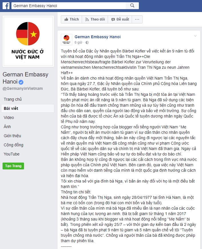Bộ Ngoại giao Đức ra thông cáo báo chí về việc chị Trần Thị Nga bị tuyên án 9 năm tù tại Việt Nam: http://www.auswaertiges-amt.de/DE/Infoservice/Presse/Meldungen/2017/170727_Vietnam.html