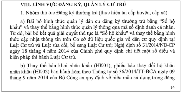 Ở nhóm thủ tục đăng ký thường trú sẽ bãi bỏ hình thức quản lý dân cư đăng ký thường trú bằng „sổ hộ khẩu“ và thay thế bằng hình thức cập nhật thông tin trên Cơ sở dữ liệu quốc gia về dân cư.