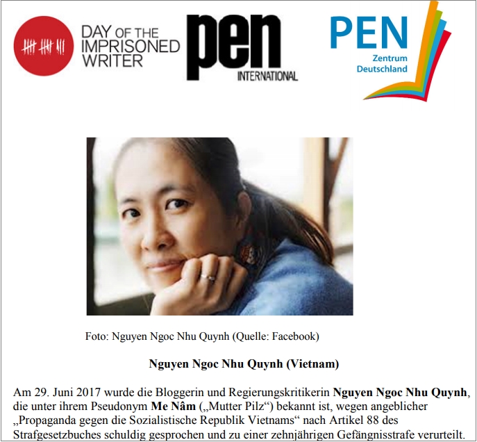 Bản tin ra ngày hôm qua 15.11.2017 với hàng tít „Văn bút Quốc tế (PEN) tưởng nhớ những người cầm bút trong tù„ được đăng trên trang web của đài 3sat, một trong những đài truyền hình lớn của Đức, cho biết Mẹ Nấm là một trong năm trường hợp tiêu biểu được Văn bút quốc tế lựa chọn cho „Ngày của người cầm bút bị tù đày“ năm 2017.