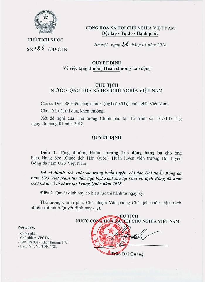 Cùng ngày, Chủ tịch nước Trần Đại Quang đã ký quyết định số 126/QĐ-CTN, tặng thưởng Huân chương Lao động hạng Ba cho Huấn luyện viên Park Hang-seo (quốc tịch Hàn Quốc), đã có thành tích xuất sắc trong huấn luyện, chỉ đạo Đội tuyển Bóng đá nam U23 Việt Nam thi đấu đặc biệt xuất sắc.