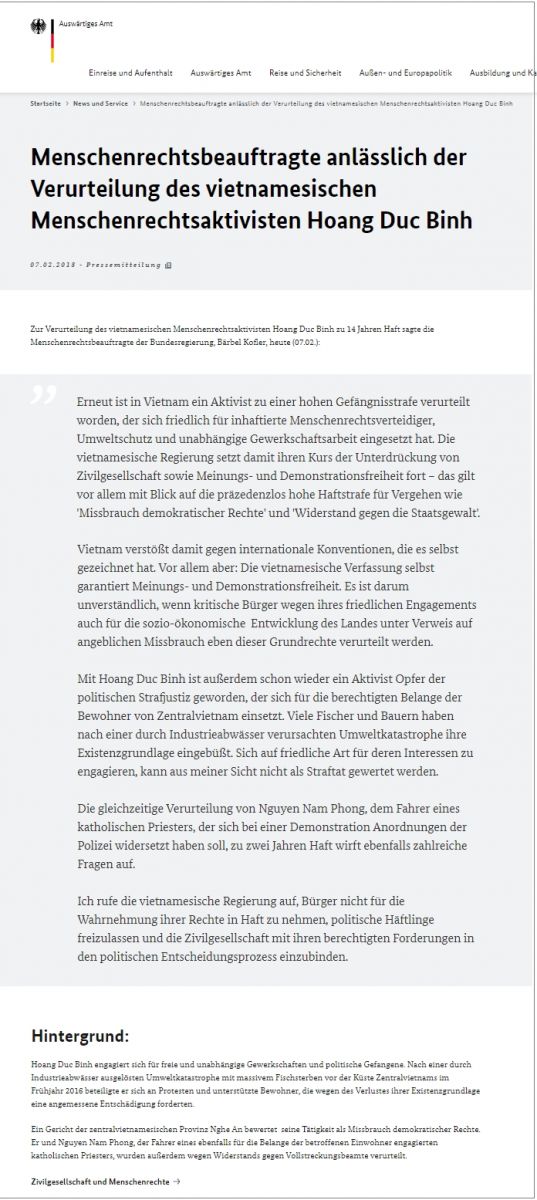 Về việc kết án nhà hoạt động nhân quyền Việt Nam Hoàng Đức Bình 14 năm tù, hôm nay ngày 07/02/2018 Đặc ủy Nhân quyền của Chính phủ Cộng hòa Liên bang Đức, bà Bärbel Kofler đã tuyên bố như sau: