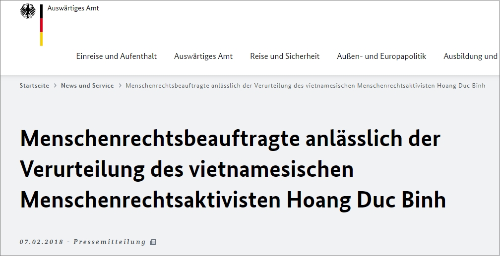 Ich rufe die vietnamesische Regierung auf, Bürger nicht für die Wahrnehmung ihrer Rechte in Haft zu nehmen, politische Häftlinge freizulassen und die Zivilgesellschaft mit ihren berechtigten Forderungen in den politischen Entscheidungsprozess einzubinden.´´